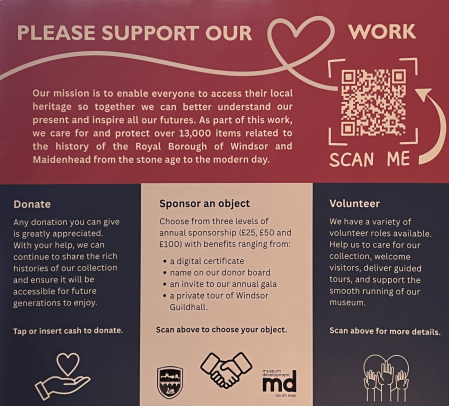 The Museum is moving ahead with recommendations from the independent audit to help sustain it into the future. This board, near the entrance, highlights two recent additions: Sponsor an Object and Tap to Donate.