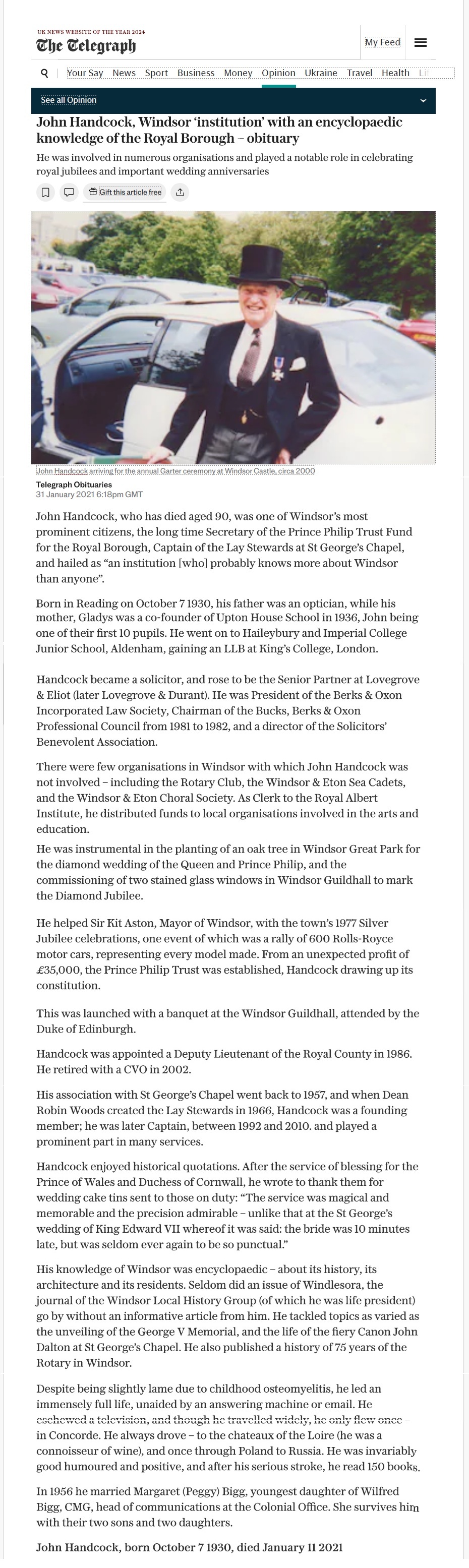 John Handcock CVO, DL was the Chairman or President of many Windsor Societies and was Clerk to the Trustees of the Royal Albert Institute Trust when it closed and they gave many very important artefacts to the Council in 2002 . These are now in the museum or hanging on the walls in the Chamber upstairs. He was Secretary of the Prince Philip Trust Fund for the Royal Borough and, as such, had tea with the Queen and Prince Philip. He was captain of the Lay Stewards at St Georges Chapel and was also president of Windsor & Eton Opera. There is an extensive obituary in the Daily Telegraph.