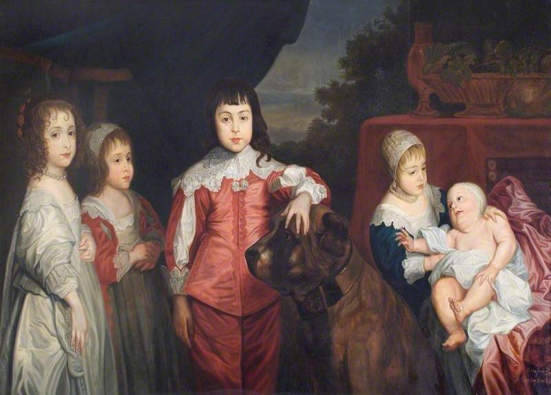 Finally, we look at the painting of ‘The Five Eldest Children of Charles I’ by Charles Fullwood. I point out that it’s a copy of the magnificent work by Antony van Dyck that hangs (with 9 other van Dycks) in the Queen’s Gallery at Windsor Castle. The original is stunning, with the future Charles II resting his hand on the head of an enormous mastiff, which looks as if it’s about to jump off the canvas!